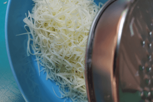 Add hard cheese (about 2/3 of the total amount), mix again. Wait for 2 minutes until the cheese melts.