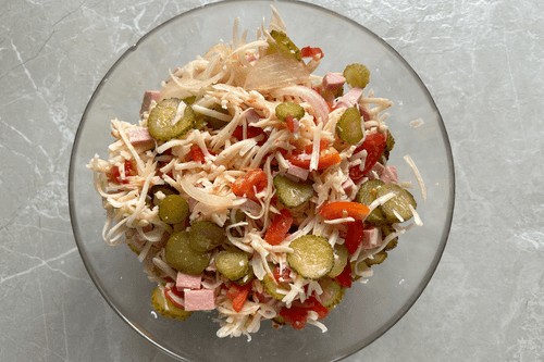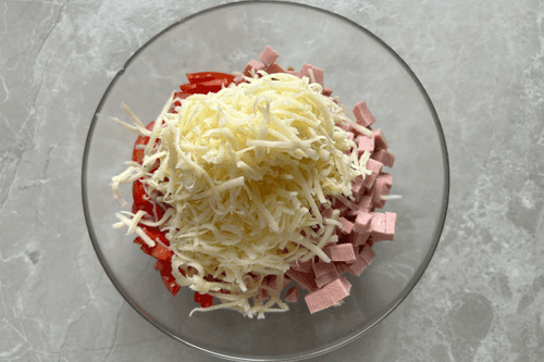 For the filling, chop cucumbers, tomatoes, onions, sausage, and grate cheese.