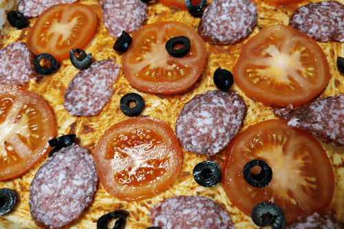 Place thin slices of sausage and tomatoes on the pizza base in a random order.