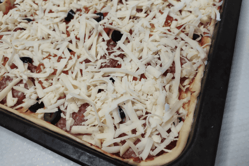 Sprinkle grated mozzarella cheese on top. Bake in the oven at 180 degrees for 15-20 minutes until a golden cheese crust forms.