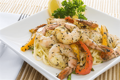 Divide the pasta onto plates, top with shrimp. Serve with lemon wedges.