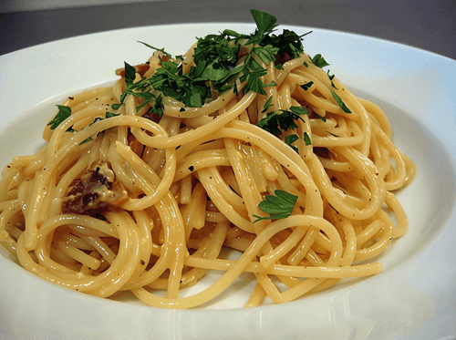 Drain the pasta in a colander, saving half a cup of water. Let the spaghetti dry slightly for 5-10 seconds (they should remain slightly moist), then transfer to a warmed serving bowl.