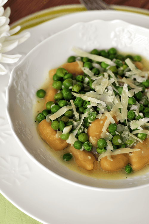 Add the remaining butter to the puree. Wait for it to melt, then add the pasta and frozen green peas to the pan. Cook for 2-3 minutes until the sauce thickens again.
