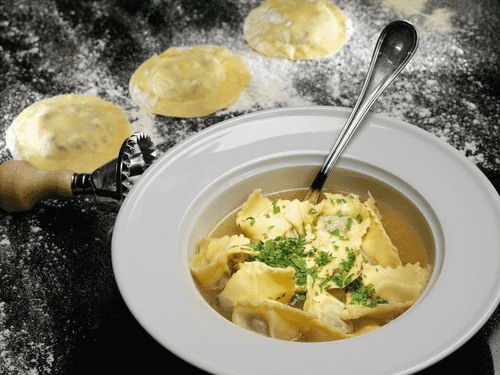 Ravioli with beef in chicken broth