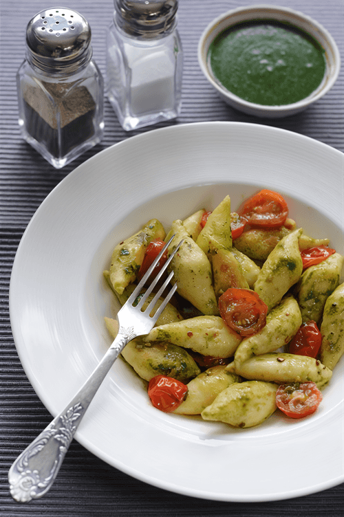 Gnocchi with cheese and arugula dressing