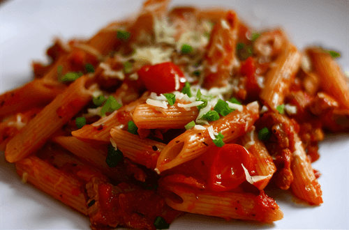 Penne rigate with pork tenderloin is a delightful dish of Italian cuisine that combines rich flavors of meat, vegetables, and tomato sauce. Historically, penne rigate pasta was created to perfectly hold sauces, and the combination with tender, juicy pork gives this dish a special depth of flavor. The spiciness of chili, sweetness of cherry tomatoes, and aroma of basil make it even more appetizing. Serving it with grated parmesan and green onions adds completeness and Italian flair. This is the perfect dish for a cozy dinner or festive table; it's easy to prepare while possessing restaurant-quality. Penne rigate absorbs the sauce well, making each bite rich and harmonious.