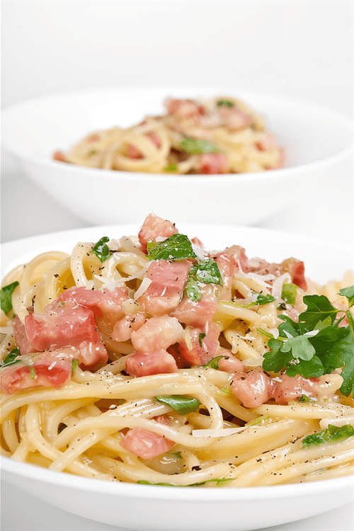 Spaghetti carbonara with ramson is an original and aromatic version of the classic Italian dish. The history of carbonara dates back centuries to Roman shepherds who made pasta with eggs, cheese, and bacon, creating a hearty and nutritious meal. The addition of ramson gives this recipe a spring freshness and a spicy garlic note. Tender spaghetti coated in creamy parmesan sauce and egg yolks creates a velvety texture, while pancetta adds an appetizing crunch. Ramson not only enhances the flavor but also makes the dish special—perfect for those wanting to try carbonara with a light herbal accent. Serving with parmesan and olive oil completes the harmony of flavors, making this dish a true gastronomic delight.