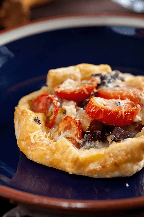 Roll each piece into a thin circle, place on a baking sheet, brush the surface with egg yolk, place tomato slices in the center, sprinkle with salt, arrange slices of lightly fried onion around, and add cheese cubes at the edge.