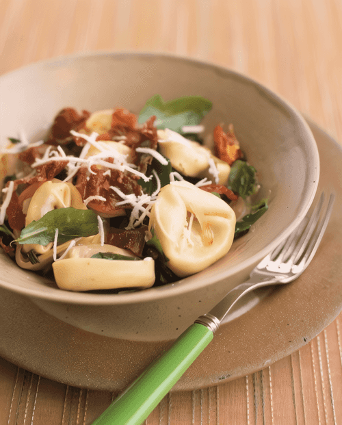 Add onion with ham, arugula, and sprinkle grated Parmesan to the cooked tortellini.