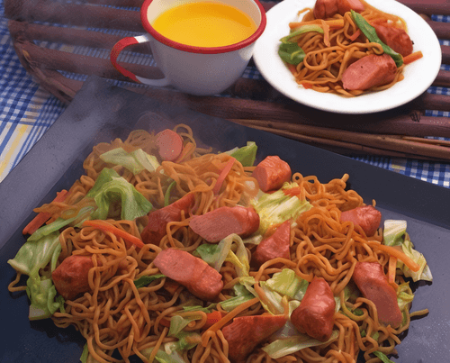 Cut the sausages into four pieces, mix with noodles, and add soy sauce.