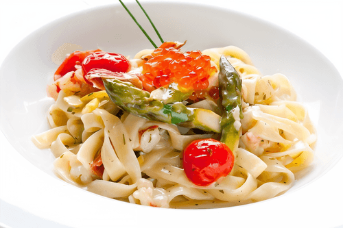 Fettuccine with asparagus and caviar is an exquisite dish of Italian cuisine that combines the freshness of vegetables, the tenderness of cheese, and the luxury of caviar. Legend has it that Italian chefs began adding asparagus to pasta for its crunchy texture and spring aroma, while red caviar became a symbol of culinary elegance. The fettuccine is enveloped in a creamy sauce with melted mozzarella cheese, creating a harmony of softness and richness. The slight bitterness of asparagus is balanced by delicate butter and the subtle aroma of black pepper. Caviar adds elegance to the dish with a salty depth and pleasant textural contrast. Served with sun-dried tomatoes, this dish becomes a true gastronomic delight, perfect for a festive dinner or romantic evening.