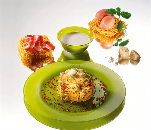 Pasta with Carbonara sauce is an interpretation of a classic Italian dish with a rich, creamy flavor and appetizing texture. The sauce made from sour cream and egg yolks gently coats the pasta, creating a delicate creamy consistency. The aroma of smoked bacon and cracklings adds a distinctive spicy note to the dish. This variation of Carbonara is perfect for a cozy home dinner, delighting with its rich taste and simplicity of preparation. In Europe, Carbonara is considered a symbol of traditional Italian cuisine rooted in the cooking of Roman shepherds who made it from accessible ingredients to create a tasty and hearty meal. Today this recipe has become popular in various countries, gaining new interpretations like using 'Rollton' noodles, making it even more accessible and original.