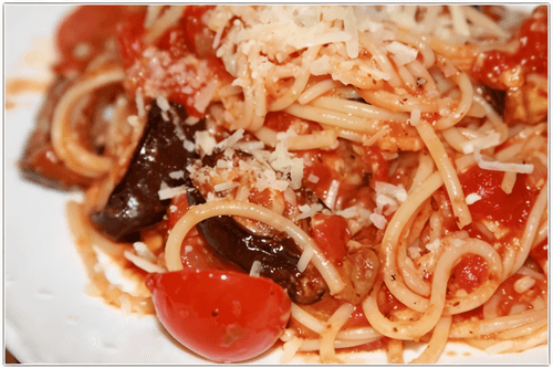 Pasta with cherry tomatoes, olives and parmesan