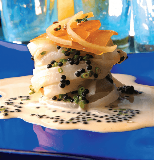 Daikon carbonara with mullet caviar and lemon zest