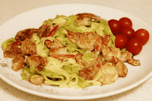Fettuccine with shrimp is an exquisite dish of Italian cuisine that combines tender pasta, aromatic seafood, and a rich creamy-wine sauce. The origins of this recipe lie in traditional Mediterranean gastronomic experiments where pasta is always the base and seafood is a harmonious addition. The dish has a refined taste: the creamy texture of the sauce gently envelops the firm fettuccine, while the shrimp add a sea freshness. Added zucchini brings lightness and balance, creating an unmatched gastronomic pleasure. Perfect for a romantic dinner or festive lunch, it gives the feeling of traveling to a cozy Italian restaurant. It's simple to prepare but looks worthy of restaurant level.
