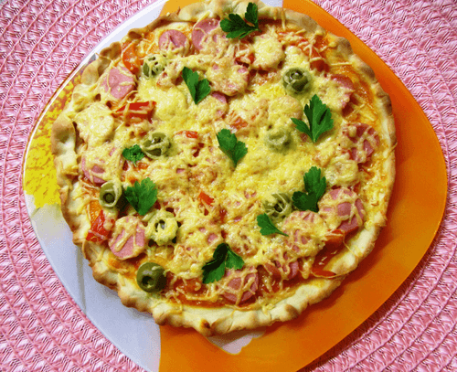 Pizza with sausages and vegetables is a homemade version of the beloved Italian dish that has adapted to the tastes of different nations. Its tender dough soaked in a spicy sauce made of mayonnaise, mustard, and garlic perfectly complements juicy pieces of sausages, fresh tomatoes, and crunchy cucumbers. The aroma after baking whets the appetite, while melted Poshikhonsky cheese adds softness and creaminess. This pizza is an excellent option for a cozy family dinner or friendly gatherings. The simplicity of preparation makes it accessible even for beginner cooks, and the ingredients can be easily substituted to taste. It can be served with herbs and favorite sauces to enjoy the harmony of flavors.