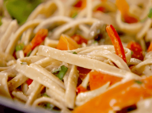 At the same time, boil the pasta, leaving 0.5 cup of water. Mix the pasta with the vegetable sauce, adding a little of the reserved pasta cooking water if the dish is too thick.