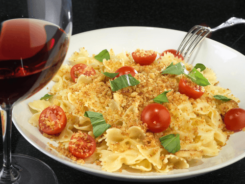 Cook the farfalle until al dente. Drain the water, add a little olive oil, and before serving, sprinkle with crumbs and garnish with halved cherry tomatoes and basil leaves.