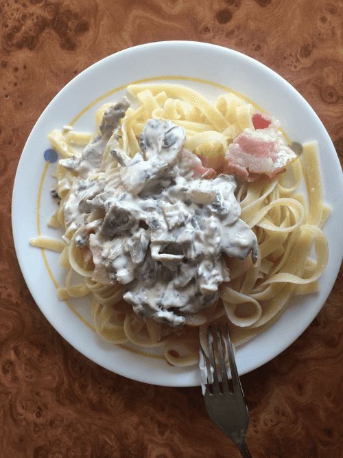 Spaghetti carbonara with champignons