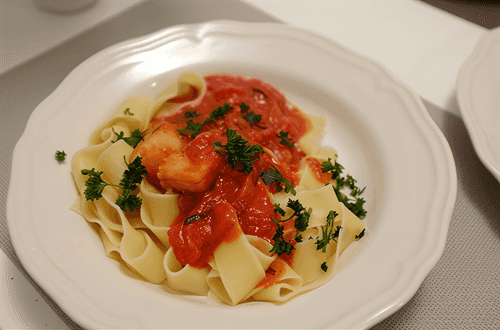 Pappardelle with scallops is a true embodiment of Italian gastronomic elegance. The wide pasta ribbons soaked in aromatic sauce carry the richness of marine tones thanks to the tender scallops. This recipe has roots in Mediterranean cuisine, where seafood has always played a key role. The dish's flavor is remarkably layered: the light sweetness of the scallops harmonizes with the rich tomato sauce accented by white wine and spicy notes of tarragon. This dish is perfect for an exquisite dinner when one wants to enjoy the depth of flavors paired with a glass of dry white wine. Served hot and garnished with fresh parsley, it adds freshness and completes the flavor symphony. Each forkful evokes a sense of journey through cozy Italian trattorias where food is art.