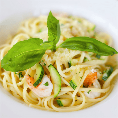 Spaghetti with shrimp and zucchini