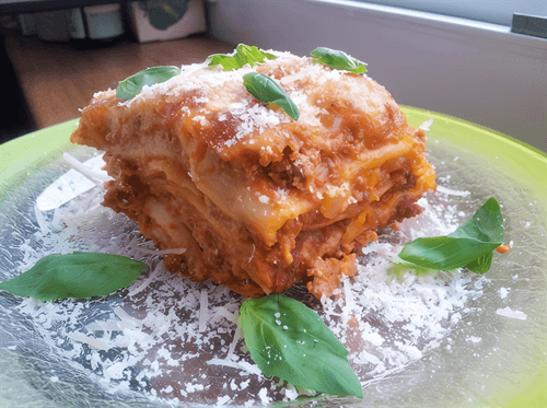 Meat lasagna is a classic Italian dish that combines tender layers of pasta with rich meat sauce and aromatic cheese. Its history traces back to the Emilia-Romagna region, where lasagna became a symbol of home comfort and traditional cuisine. In this recipe, the depth of flavor comes from the combination of ground beef, tomato sauce, cream, and parmesan, enhanced with spicy ginger. An amazing ingredient is vodka, which highlights the richness of the sauce. The layered structure of lasagna allows each piece to be perfectly infused with the aromas of the sauce and melted cheeses. This dish is a true celebration of flavors, suitable for cozy family dinners or festive occasions. It pairs wonderfully with a glass of red wine and fresh herbs like basil and oregano.