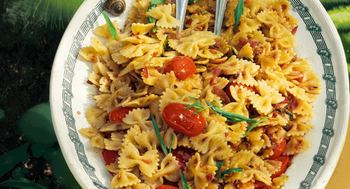 Add a pinch of black ground pepper, a pinch of thyme leaves, finely chopped parsley and tarragon leaves, a little salt and a little sugar to give the tomatoes sweetness. Mix all this with the farfalle and sprinkle with grated dried caviar.