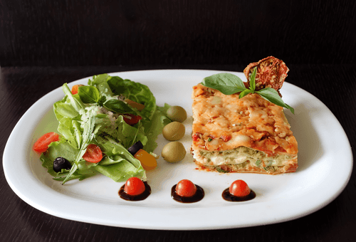 Grease a sheet of foil with olive oil, cover the lasagna with it, and bake in the oven for 25 minutes. Remove the foil and bake for another 10 minutes until golden brown.