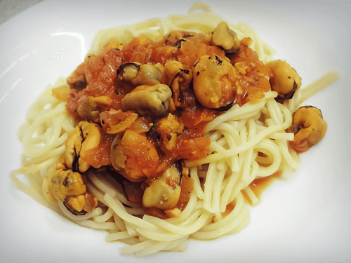 Spaghetti with mussels in tomato sauce is a harmony of sea and tomato shades, creating a rich and aromatic flavor. The dish originated in the coastal cities of Europe, where fresh mussels pair perfectly with classic pasta. The delicacy of the tomato sauce, enriched with spicy seasonings and herbs, highlights the tenderness of the mussels, while the slight acidity of the tomato juice adds a special zest. The spaghetti soaked in the rich aroma of the sauce becomes surprisingly juicy and appetizing. This dish is perfect for family dinners as well as festive tables, where it impresses guests with its elegance and simplicity of preparation. A light touch of parsley adds freshness, making it a true culinary masterpiece of Mediterranean cuisine.
