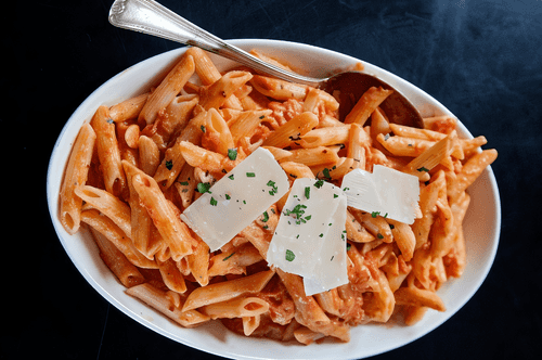Penne with vodka is a dish rooted in Italian cuisine that has gained popularity in Europe and America. The main feature of the recipe is the addition of vodka to the tomato-cream sauce, enhancing its flavor and intensifying the aroma of garlic, spices, and fresh tomatoes. The spiciness of chili is balanced by the creaminess and the zest of parmesan, creating a harmony of flavors. The combination of dense penne pasta and velvety sauce makes it ideal for cozy dinners. It is served with herbs that add freshness and contrast. Penne with vodka can be prepared as an everyday dish but also graces festive tables with its rich texture and appealing aroma.