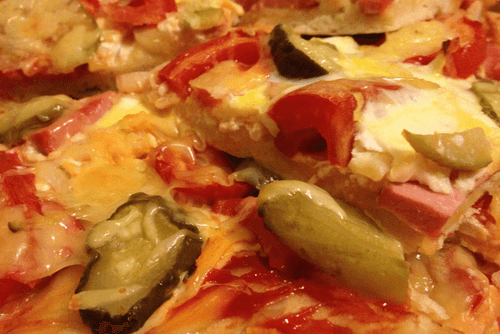 Spread tomato paste (tomatoes, garlic, basil, salt, pepper) on the dough and any filling (onion, pickled/salted cucumbers, tomatoes, pepperoni/salami/ham sausage, fried mushrooms, olives).