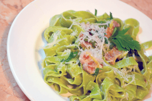 Green fettuccine carbonara is a delightful embodiment of Italian cuisine, combining the classic taste of the famous dish with an unusual green hue. Traditionally made with pasta, eggs, parmesan, and bacon, carbonara here gains freshness and originality thanks to the green fettuccine. The creamy texture of the sauce perfectly complements the tender pasta, while the crispy bacon adds an appetizing contrast. This recipe embodies the simplicity and sophistication of Italian gastronomy, allowing enjoyment of flavor without being overloaded with extra ingredients. The addition of nutmeg and fresh parsley gives the dish a special spiciness and aroma. Fettuccine carbonara is perfect for a cozy dinner at home or for special occasions when you want to delight guests with refined Italian culinary art.