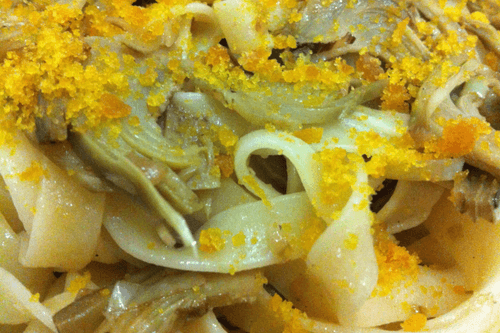 Meanwhile, chop the bottarga and cook the tagliatelle.