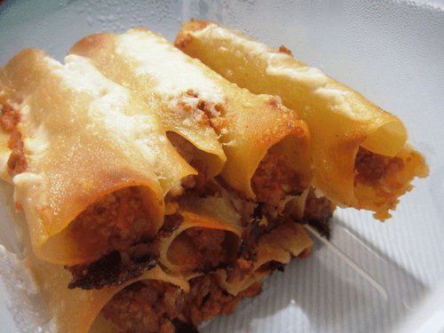 Place the cannelloni on a greased baking sheet. Pour béchamel sauce over the cannelloni and sprinkle with grated cheese (I had a mix of cheddar and gouda).