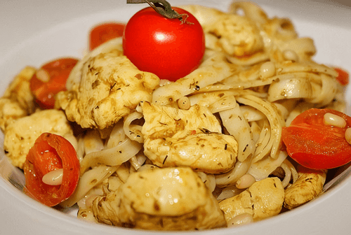 Pasta with chicken, pesto sauce and pine nuts