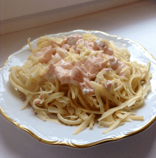 Meanwhile, finely chop the red fish - it doesn't have to be trout, any fish will do. The amount can vary - just make sure the fish doesn't exceed the pasta.