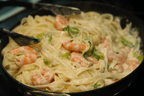 Meanwhile, we cut the salmon into cubes and sauté it in olive oil with shrimp.