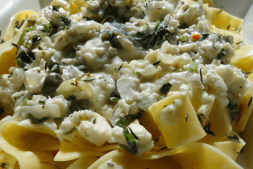 Pappardelle with white fish, roquefort and spinach sauce