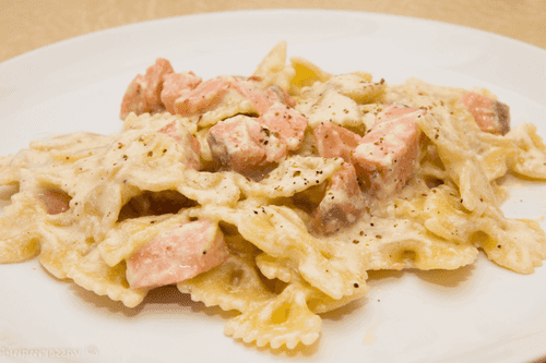 Farfalle with smoked salmon is an exquisite dish of Italian cuisine that combines tender pasta and aromatic smoked salmon. Farfalle, known for their 'butterfly' shape, hold creamy parmesan and mustard sauce beautifully, giving each bite a rich flavor. The smoked salmon adds a light salty note, creating a harmonious blend with the cream's softness. This dish is perfect for a festive dinner or a cozy evening with loved ones. Its history traces back to the traditions of northern Italy where pasta is often served with fish sauces. Served hot, garnished with freshly ground pepper and an extra portion of parmesan to enhance its rich taste. The flavor is delicate, creamy, with a slight spiciness from the mustard that leaves a pleasant aftertaste. A true delight for lovers of Italian gastronomy!