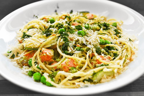 Pasta with salmon, zucchini and green peas