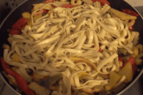 Add the noodles and sauce, mix well for a couple of minutes, and serve.