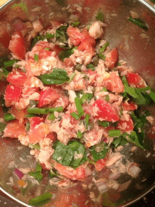 Drain the oil from the tuna can and break it into large pieces by hand into the tomato mixture. Season with salt and pepper to taste and gently mix.
