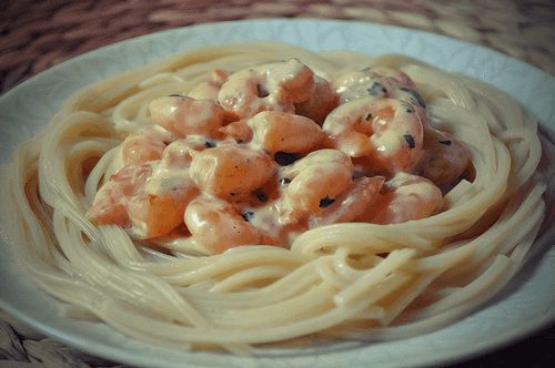 Spaghetti with shrimps in creamy cognac sauce