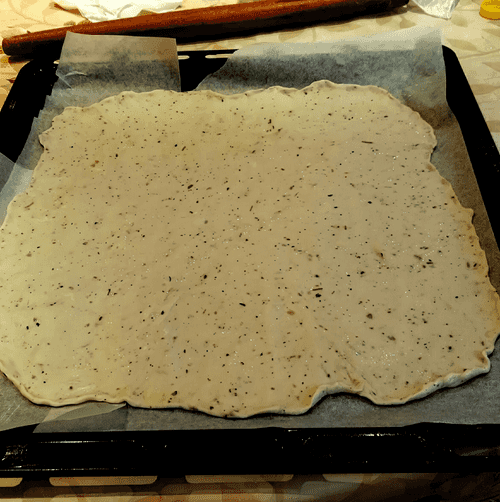 Take out the dough, knead it a little with your hands, and roll it out on a surface, sprinkling a bit of flour (it won't stick to the surface, the flour is just in case).