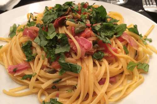 Tagliatelle with pancetta is a true embodiment of Italian culinary simplicity and elegance. This dish hails from the Emilia-Romagna region, where fresh pasta and rich flavors are the heart of gastronomy. Tender pancetta adds depth and a slight saltiness to the sauce, while cherry tomatoes contribute a fresh tanginess. White wine enhances the aroma, and garlic and basil provide characteristic spiciness. Italians love to prepare this dish for cozy family dinners or among friends, enjoying its harmony of flavors. Topped with grated Parmesan, it acquires a creamy texture and rich cheesy taste. It’s the perfect choice for those who appreciate tradition and simplicity but don’t want to sacrifice sophistication. Tagliatelle with pancetta is Italy on your plate—generous and hospitable like the country itself.