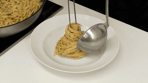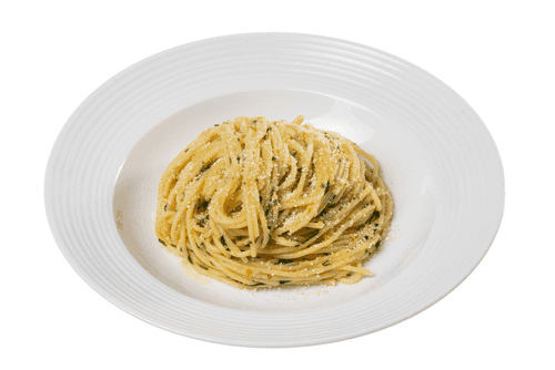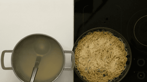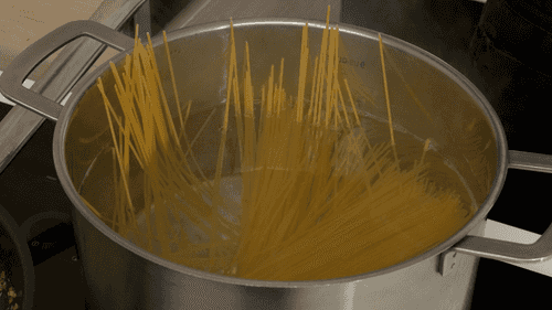 Boil the spaghetti in a large amount of salted water until cooked. Once the pasta is ready, fill a glass with the water it was cooked in and set it aside.