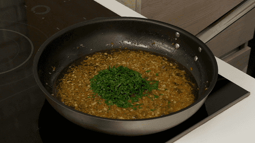 In a large skillet, heat olive oil, add minced garlic, finely chopped anchovies, and chili pepper. Sauté everything on low heat until the anchovies almost completely dissolve. Then add chopped parsley and the remaining anchovies, mix and turn off the burner.