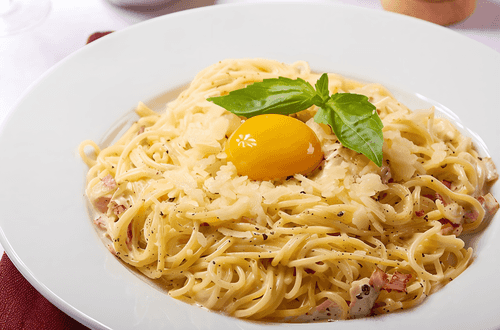 Spaghetti carbonara is one of the most famous dishes of Italian cuisine, originating from the Lazio region. Simple yet exquisite, it combines the tenderness of pasta with the rich flavor of bacon and a creamy texture enhanced by parmesan and aromatic black pepper. Legend has it that this dish was first prepared by Roman charcoal workers (carbonari), hence its name. A distinctive feature is the use of egg yolk, which gives the sauce silkiness and richness. White wine adds a slight acidity, while basil decorates and completes the composition. It’s an ideal choice for a cozy dinner when you want to enjoy the true taste of Italy.