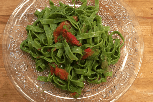 Boil the tagliatelle according to the package instructions. Drain the water and add to the vegetables. Mix well.