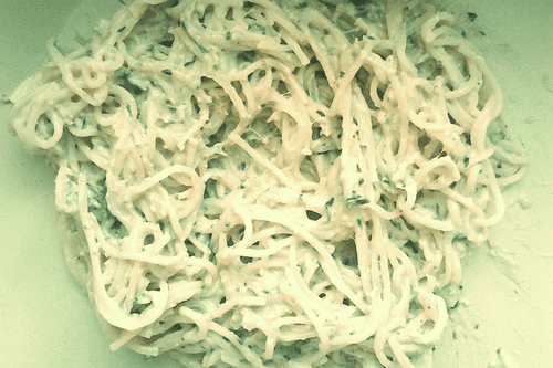 Put the pasta on the heat, and while it boils, make the béchamel sauce. Pour milk into a pot, gently heat it, and gradually add flour and ginger while constantly whisking.